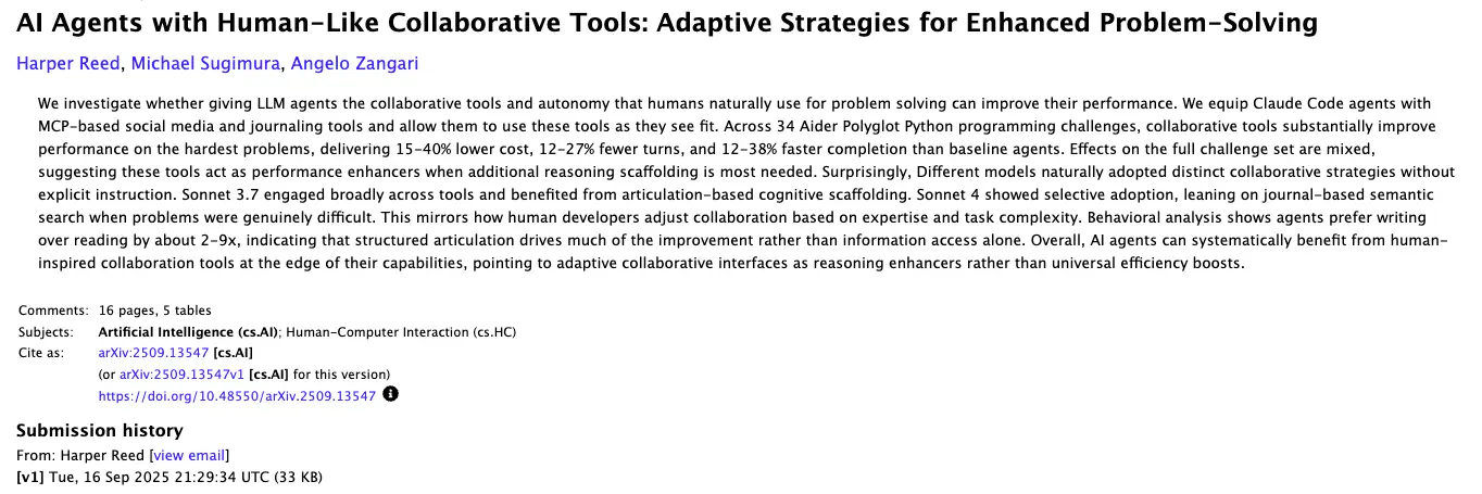 Our findings seem to suggest that lightweight, non-prescriptive collaboration tools (in this case social media feeds and journals) help agents “punch above their weight,” especially when confronted with genuinely difficult tasks.